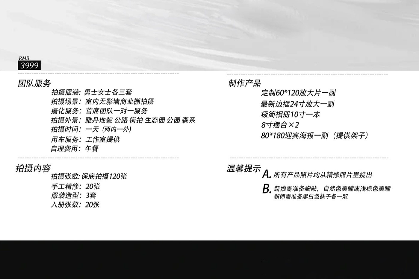 拍摄前一晚敷面膜,剔除腋毛,头发洗完吹干,不要扎它,明天早上来化妆的时候,可以带自己的护肤品,彩妆用品过来,搭配使用,如果没有就不带,你提前准备好胸贴,美瞳,穿浅色内衣,你们有自己的白色体恤,牛仔裤和小白鞋的话,明天直接穿着过来就可以,你老公准备黑白袜子两双,有自己的白体恤和白衬衣可以带过来,有特别喜欢的西装,也可以带上,一切为了拍照,呈现最好的效果[爱心]