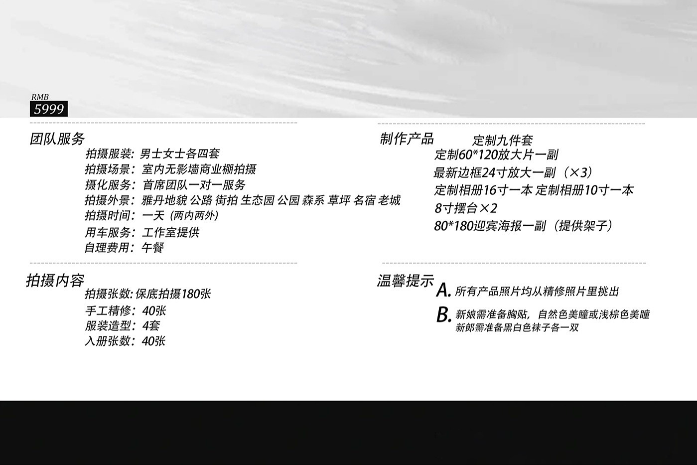 新娘需准备胸贴,自然色或者浅棕色美瞳,拍摄头一天洗头,去除腋毛,新郎需要备黑白两双袜子,自己有合适的西装跟皮鞋可以带上